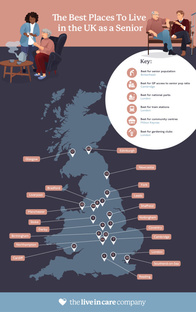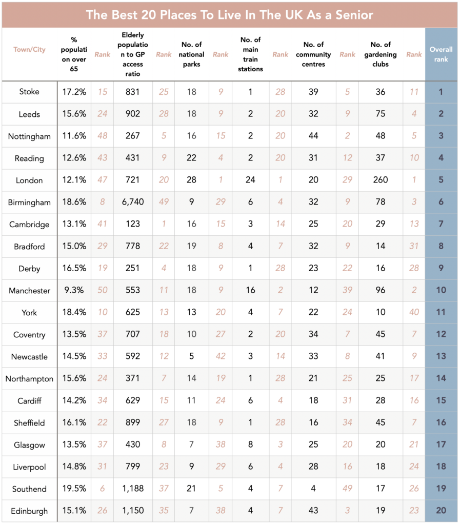 Taking all six factors and data into account, Stoke came out as the UK’s best place to live as a senior, scoring highly for number of national parks, community centres and gardening clubs.