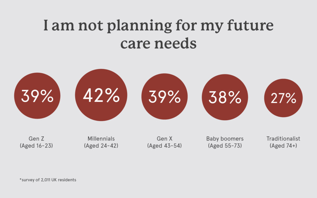 According to our research, 39% of people are not planning for their future care needs. Despite generally living longer, women appear to be less prepared, with over 44% not planning for their future care compared to 33% of men. But how does future care planning differ across generations?