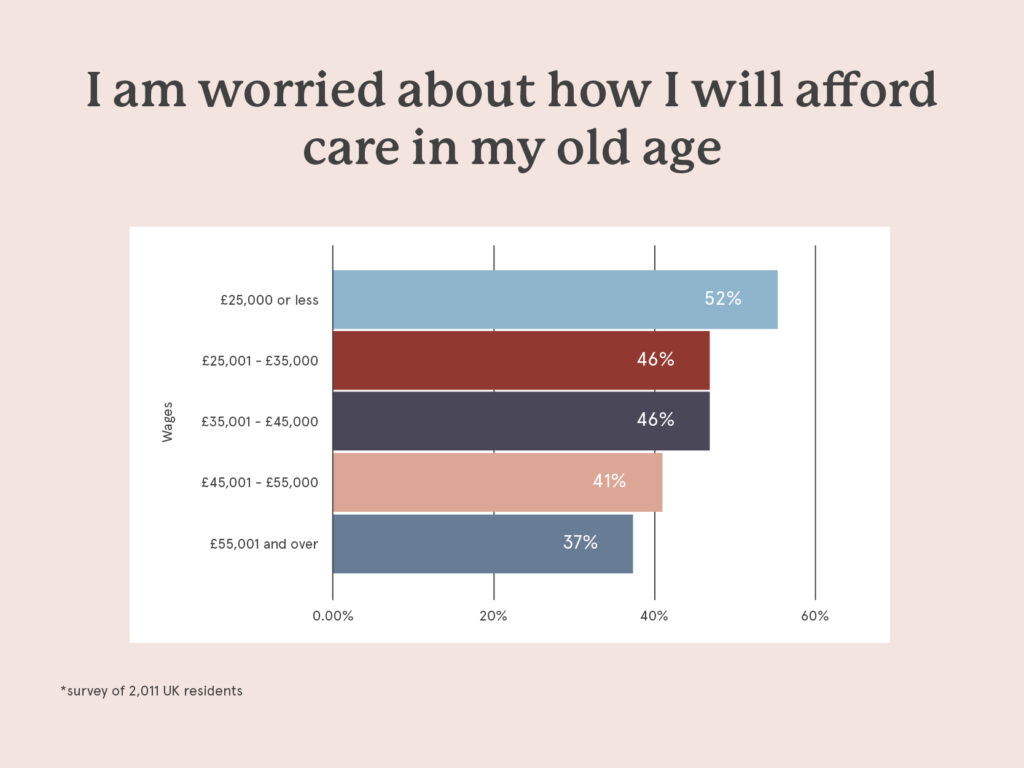 With so many people not planning for their future, it’s not surprising that 45% are worried about the cost of future care and an additional 50% are concerned about the quality of care they may receive. Our survey results reveal that 52% of lower earners are worried about how they will afford care in later years, but how does this compare across wage brackets?
