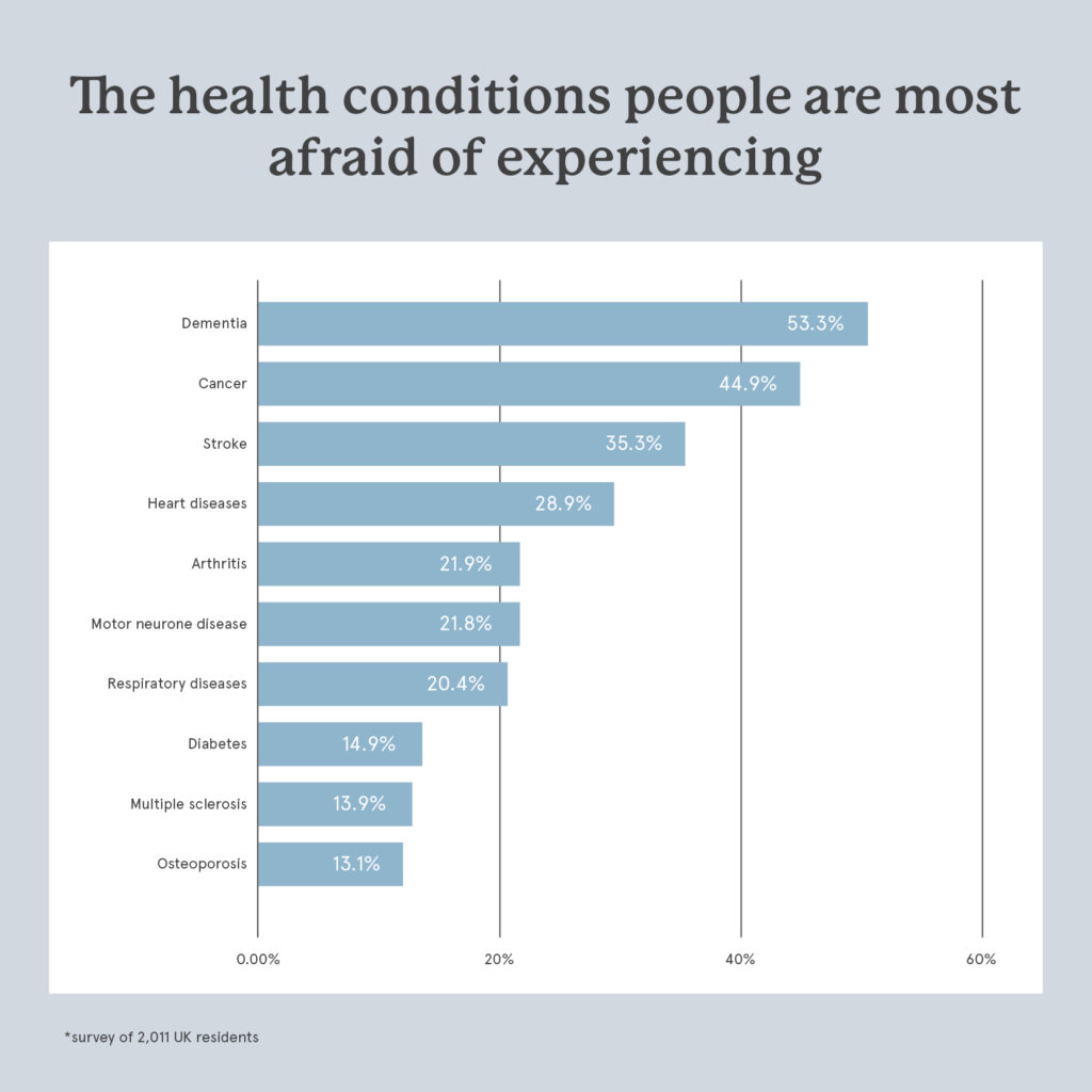 Unfortunately, there are many health conditions associated with ageing which may be worrying, especially for those whose loved ones have experienced them. According to our survey, 36% of people are very worried about later life, having seen their own family members experience the need for care. But which health conditions are people most afraid of experiencing?